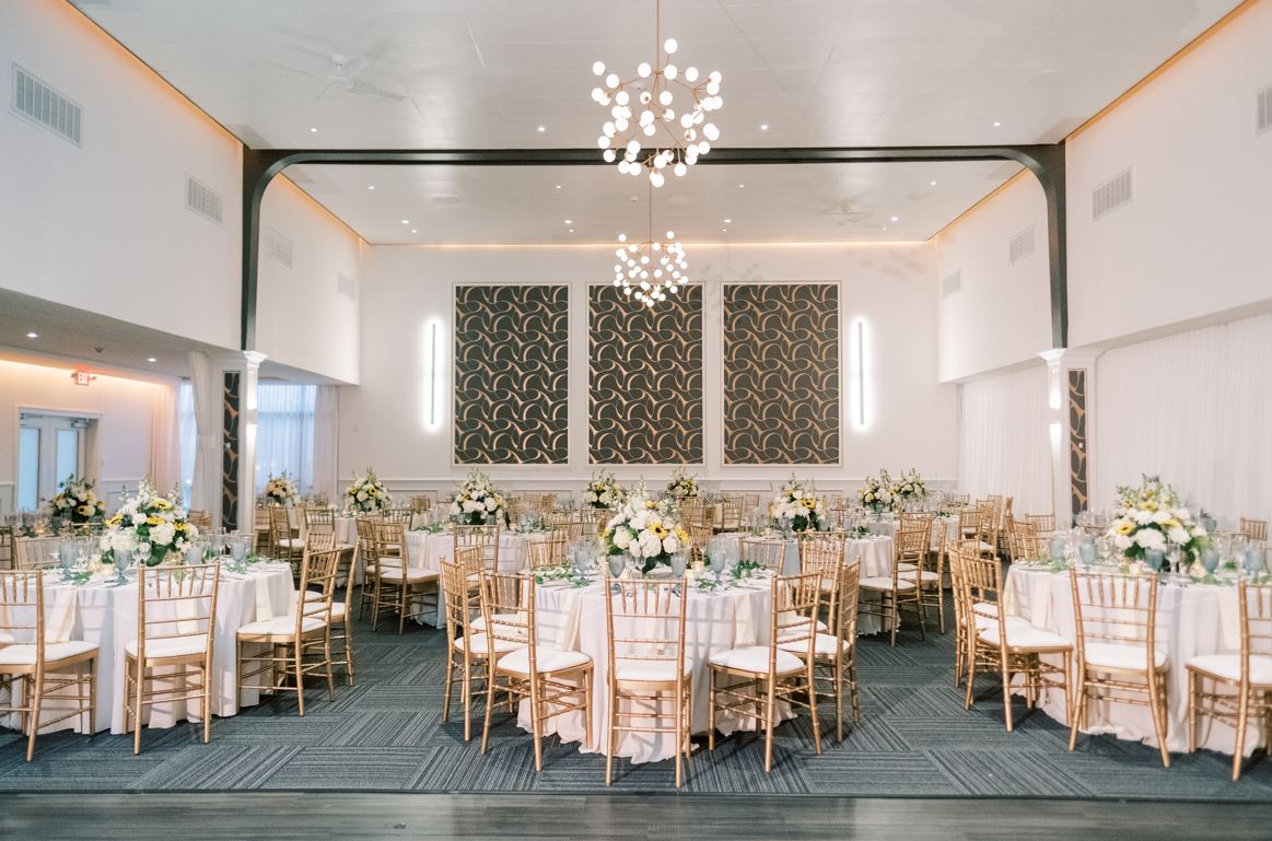 - Tables, White Wooded Ceremony Chairs, Gold Chiavari Chairs